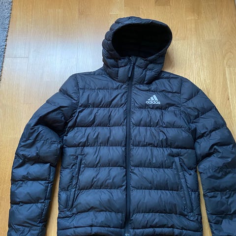 Adidas vinterjakke i størrelse S, svart farge. Jakken er designet for menn og egner seg til bruk i kalde værforhold. Den har hette og glidelåslommer.