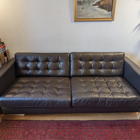 Sort IKEA skinnsofa selges. Hvis jeg husker rett, er den ca 187 cm lang og ca. 82 cm dyp.