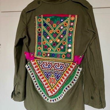 Selger denne vintage monikmo denim jakken. Den har håndlaget vintage afghansk broderi, som brukes i tradisjonelle brudekjoler. Hver jakke har sin egen historie, så derfor er heller ingen jakker like.
