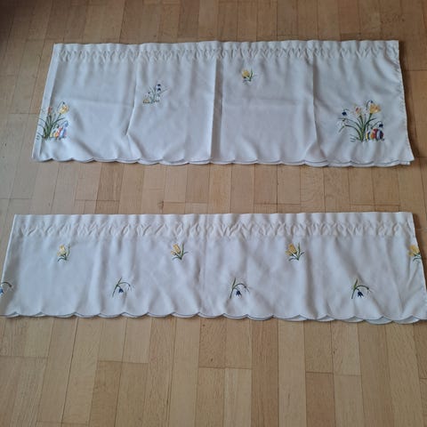 Gardinlengder i bomull med blomstermønster i lilla og grønt på kremhvit bakgrunn. To lengder. 200kr pr.del.