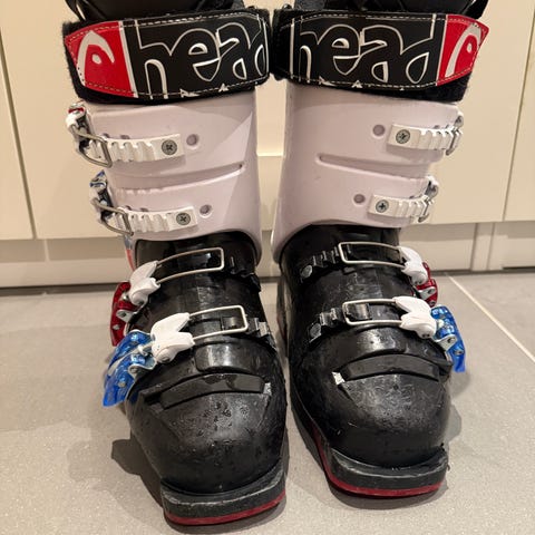 Head RX skistøvler med størrelse 273 mm i hvit farge. Støvlene har tre justerbare spenner for tilpasning og støtte. Designet for alpinski, egnet for bruk av personer som passer denne størrelsen.