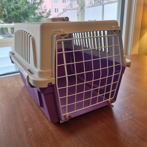 Transportbur til katt/hund i hardplast. Kjøpt nytt i 2025. Lokket kan tas av. Brukt et par ganger.