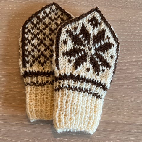 Hjemmestrikket selbuvotter til baby. Passer ca str 62-74. Strikket i hvitt og brunt 💯 % ullgarn
