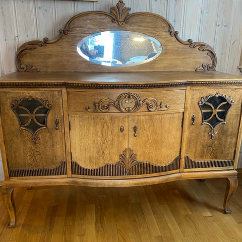 Skjenk i mahogni med skrålagt finér. Produsent er ikke merket.
