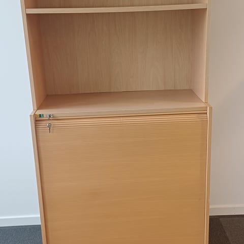 Hylle/skap i lyst tre med to hyller. Enkel konstruksjon med front som kan trekkast ned.