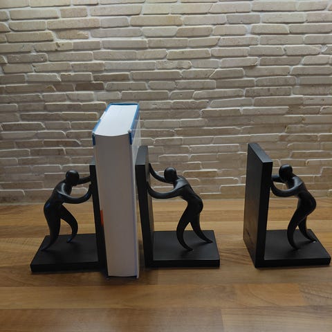 Håndlaget bokstøtte i onyx med oransje farge. Brukes til å holde bøker oppreist på en hylle eller bord. Har en dekorativ utskjæring og to deler som støtter bøkene fra hver side. Dessverre skade på ene basen, men fortsatt fullt brukbar.