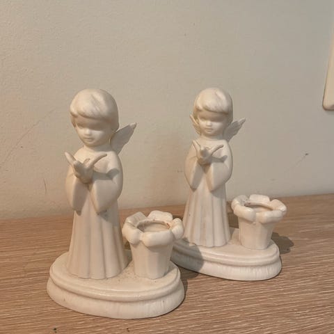 En ikke helt vanlig juleengel/ lysestake fra 60-tallet. Ca 24 cm høy. Litt avskalling ved holder for lys. Se bilde. Aner ikke noe om fabrikat.
