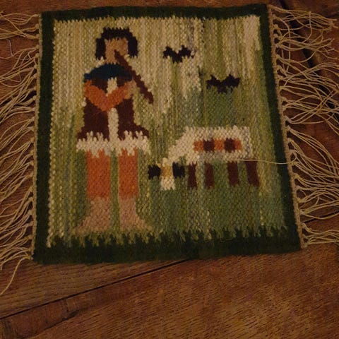 Gammelt håndlaget veggteppe med fargerike figurmotiver i rød, brun og svart. Tekstilet har et tradisjonelt design og er vevd i ull. Passer til dekorasjon av vegg i hjem eller hytte. 36*28cm.