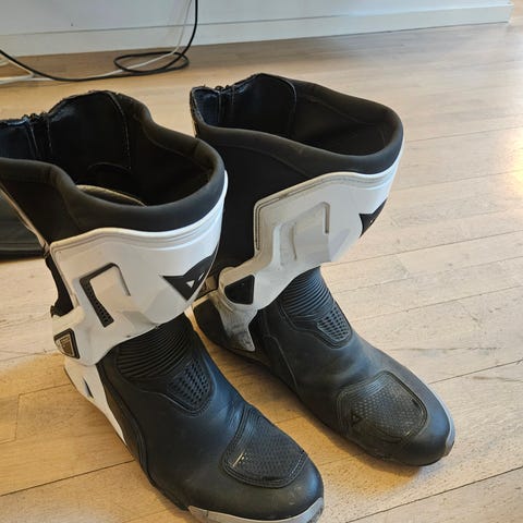 Dainese motorsykkelstøvler i svart farge. Støvlene har CE-godkjenning og er designet for motorsykkelbruk.