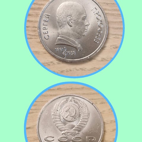 Sovjetisk 1 Rubel minnemynt. Mynten har detaljerte graveringer med profil av poeten Konatantin V. Ivanov 1890-1915 på den ene siden og Sovjetunionens emblem på revers.
