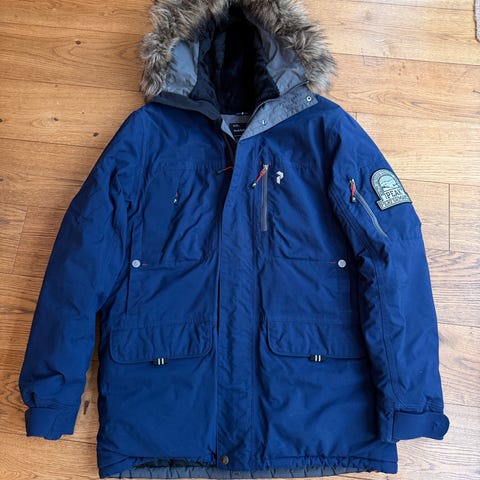 Peak Performance vinterjakke i størrelse L for herre. Jakken er gul og laget av dun, noe som gir god isolasjon og varme. Egnet for kalde værforhold.