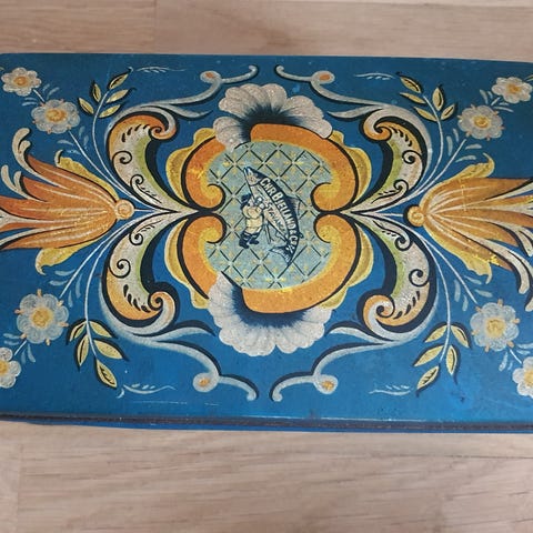Liten rund dekorboks i metall med vakkert preget mønster på lokk og sider. Lokket har en lys stein/innlegg (trolig alabast, onyx eller lignende), som gir boksen et eksklusivt preg. Egner seg godt til oppbevaring av smykker, ringer, småting – eller som dekor.