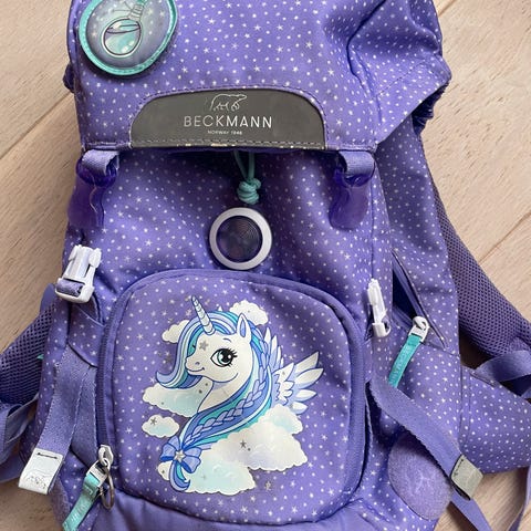 Beckmann skolesekk i lilla farge med mønster av prikker, enhjørning og havfrue. Sekken har flere lommer og justerbare stropper. Egnet for skolebruk.