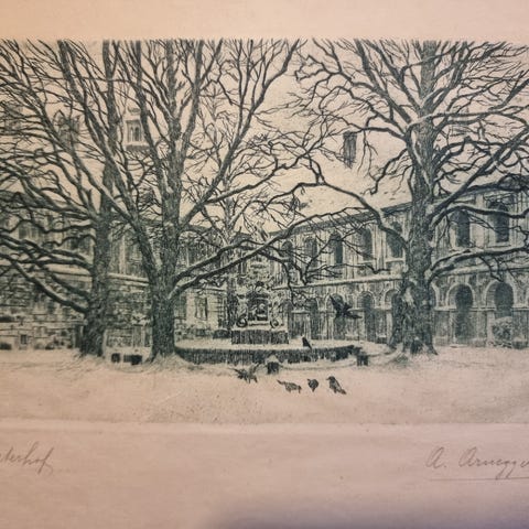 A. Arnegger – Klosterhof, signert grafisk trykk (ca. 1917)