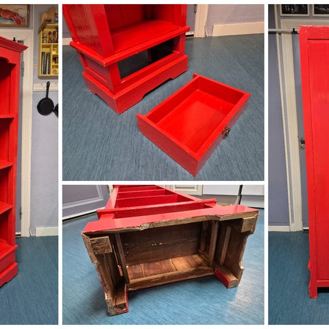 Restaurert bokhylle i solid tre selges rimelig. Hyllen er håndmalt med et unikt design.