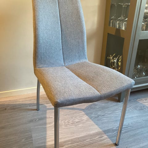 Stoff i lys grå farge, grov tekstur, lys eik ben. (Har også 8 stk med hvite ben og samme stoff)