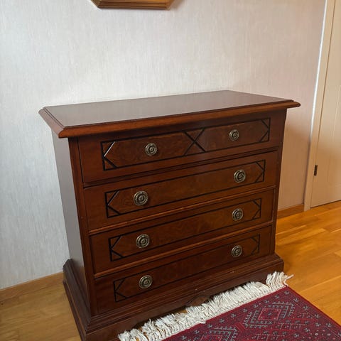 Kommoden er meget solid, i mørkt tre med 4 skuffer. Selve skuffene er av plast.