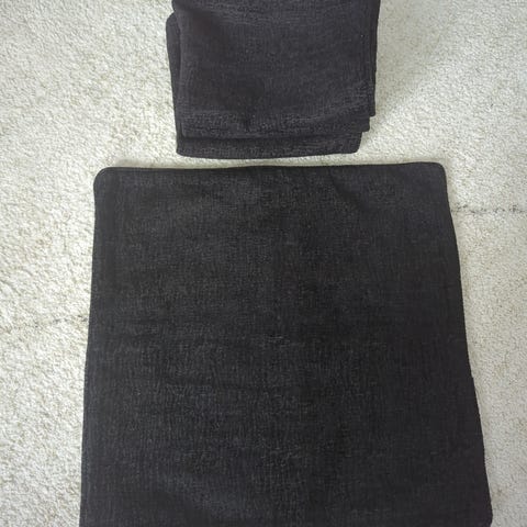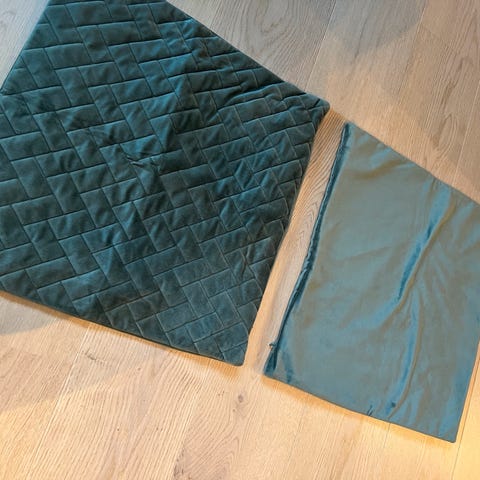 Selger to stilrene pynteputer med geometrisk mønster i rolige og tidløse fargetoner. Putene er som nye og aldri brukt, og selges komplett med både innerputer og trekk.