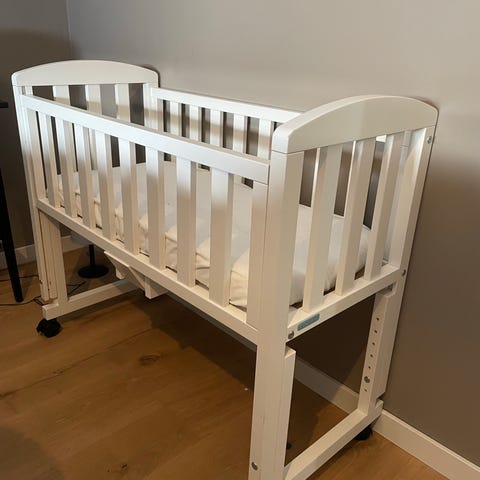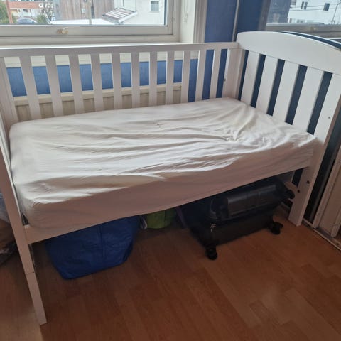 Lite brukt barneseng med madrass.Fin barneseng .En veldig solid og trygg for barn.Madrassen helt uten fleker eller skjolder.