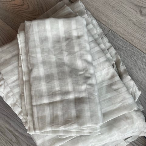 Helt nye gardiner kjøpt fra Princess. Den ene er ikke pakket inn. Jeg legger også et avkortingstape slik at du kan forkorte gardinene selv med et strykejern om nødvendig.