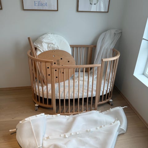 Stokke Sprinkelseng i tre med ovalt design. Egnet for spedbarn og små barn. Passer til bruk i barnerom og gir en trygg soveplass for barnet.