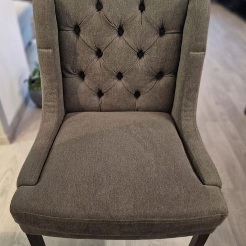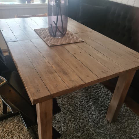 Brukt spisebord med stoler. Bordet er fra 160 cm til 223 cm med tilleggplate integrert. Noen bruksmerker ( se bildet ). 6 stoler følger med, stoltrekk i blå farge følger med også om det ønsker ( 12 stk ).