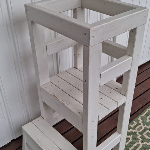 Svart montessori læringstårn. Praktisk for barn å komme opp i høyden og f.eks hjelpe til på kjøkkenet. En del bruksmerker (flasset av maling her og der) og en sprekk foran. Har ikke hatt noe å si for bruken.