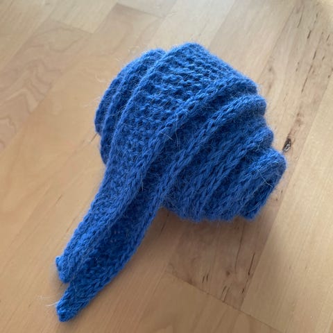 Skjerfet er strikket i den lengste str og måler 98cm på lengden.
