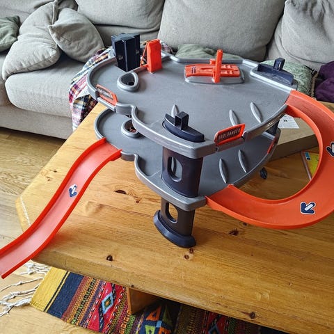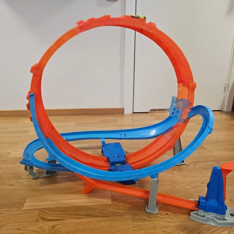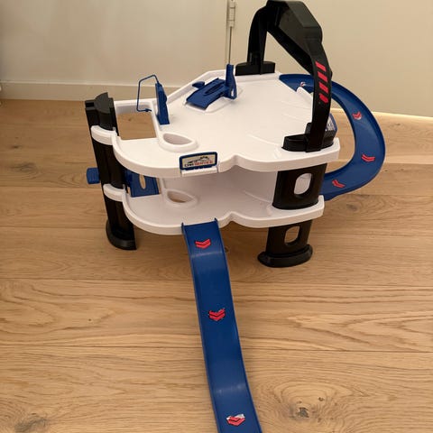 Pent brukt bilbane. Den går på strøm og har to kontroller sånn at man kan være to sammen. Bilbanen kan bygges som man vil og har loop.