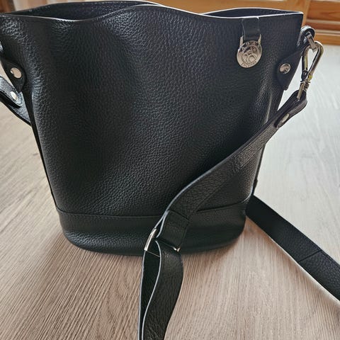 Adax skulderveske laget i lær, designet for dame. Vesken har flere rom med glidelås, inkludert et ytre glidelåslomme og et hovedrom med innerlomme. Den har justerbar skulderrem og en glatt, svart overflate.