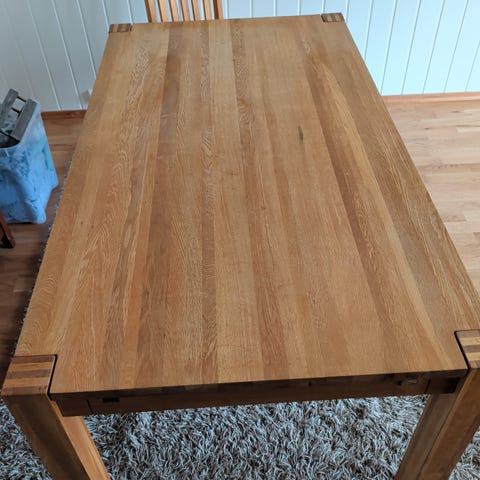 Spisebord med fiskebeinsmønster i eikefìnér med sorte stålbein. Noen riper på bein helt ned mot gulvet, se bilde. Bordplaten fremstår som ubrukt. Kjøpt for kr 5990 på Jysk. Selges grunnet oppussing. Må hentes.
