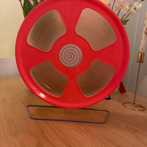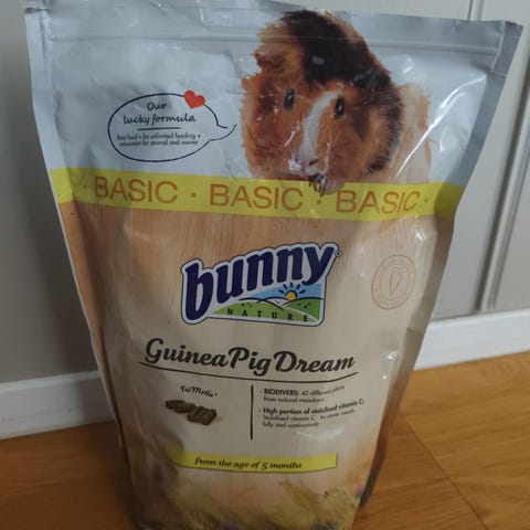 Hjul, matskål, holder til høy, hus m/trapp og fraktebur.