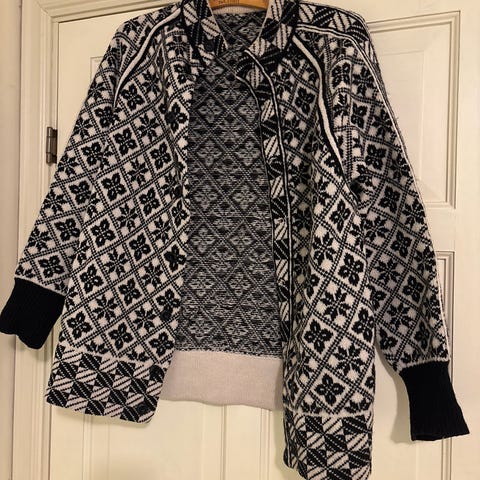 - Mønster over hele ulljakke med flerfarget mønsterbord nederst