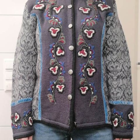 Vintage ullkofte / cardigan i 100 % ull - jacquard strikket - str. XL - 48 - 50