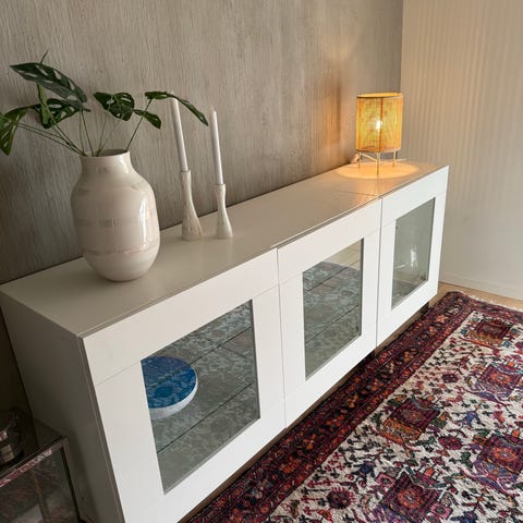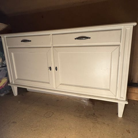Skjenken med lys, har 2 dører med 3 skuffer, jeg selger billig fordi skuffene mangler knotter og skuffen på toppen er limt se bilde 6. Knotter kan man kjøpe på Clas Ohlson. Nytt skjenken koster 3440kr