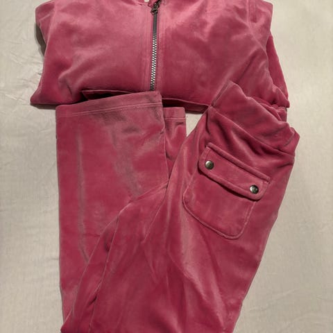 Velour joggedress i rosa farge bestående av hettejakke med glidelås og bukse med lommer foran og bak. Materialet er myk velour, og dressen har en avslappet passform. Str. 7-8 år