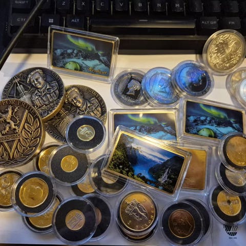 Fire skrin med forskjellige mynter og medaljer fra Samlerhuset. Se bilder for detaljer. Skrin noe brukspreg. Selges samlet 1800,- inkl. frakt.