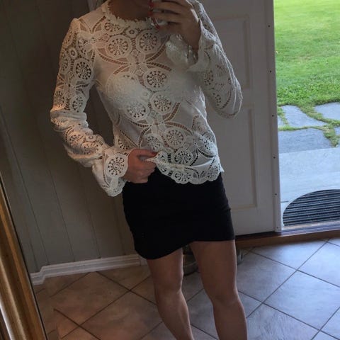 Selger en svart blondetopp i lett og myk kvalitet. Delikat blondedetaljer og tynne, justerbare stropper. Kan brukes som bralette, topp under skjorte/blazer eller alene. Pent brukt og i god stand.