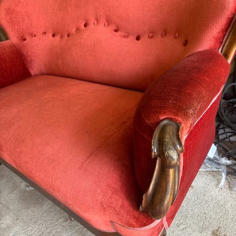 Antikk tresofa med utskjæringer og rødt stripete stoff