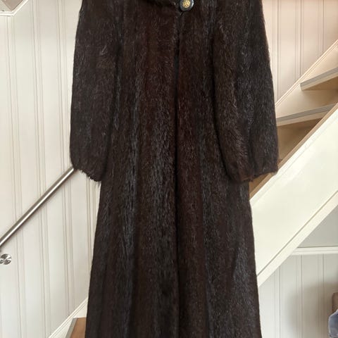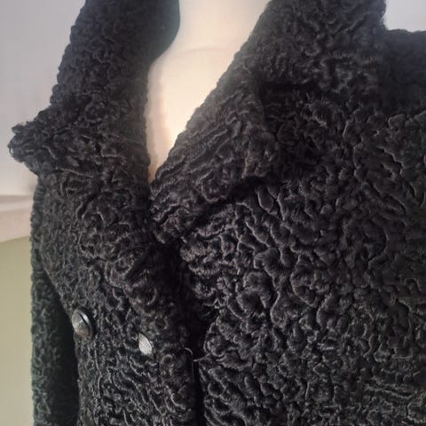Selger pen sort swakara persianer-pels i liten størrelse for min mor grunnet flytting. Pelsen har ubetydelig slitasje nederst på ermene og ved lommene, men er ellers i god stand. Den ble anskaffet en gang på 1970-tallet. Pelsen var i bruk i ca. 10 år og har vært oppbevart kjølig og beskyttet siden den gang. Lengde 120 cm, midje 90 cm, bryst 92 cm, erme fra armhule 40 cm.