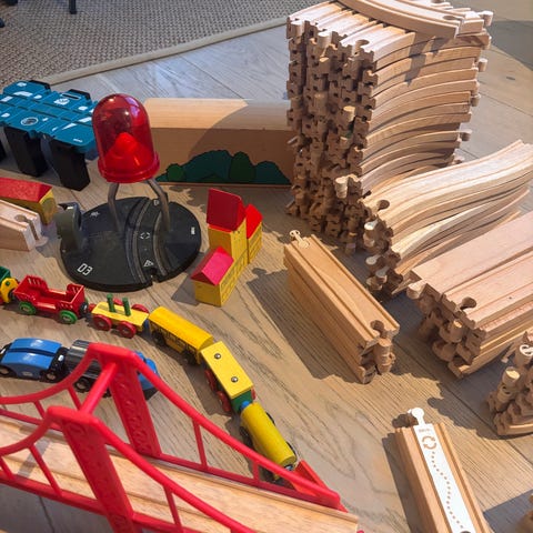 togskinner og tilbehør i tre. Sett med rette og buede skinner, kryssingsskinner og en heisbro med rød bro og tårn i tre. Passer til BRIO/ikea togbane for barn.
