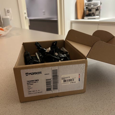 Selger et par ubrukte Marker Alpinist 12 bindinger. Som bildene viser ha de vært montert på et par ski, men aldri brukt.