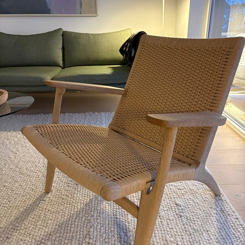 Selger en tidlig utgave av CH25, designet av danske Hans J. Wegner for Carl Hansen & Søn Møbelfabrik. Stolen har en fin struktur i treverket og er fast i rammen. Fletten er original og i god stand med unntak av brudd i front av setet (se bilder). Vi har brukt den slik uten problemer, og det er visuelt ikke spesielt synlig.