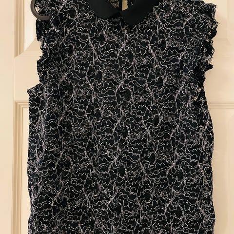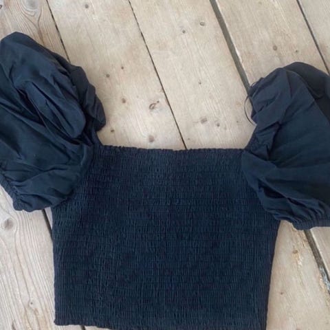 Selger en lett og feminin topp i svart med hvitt mønster. Har tynne, justerbare stropper og smock/elastisk parti bak for god passform.