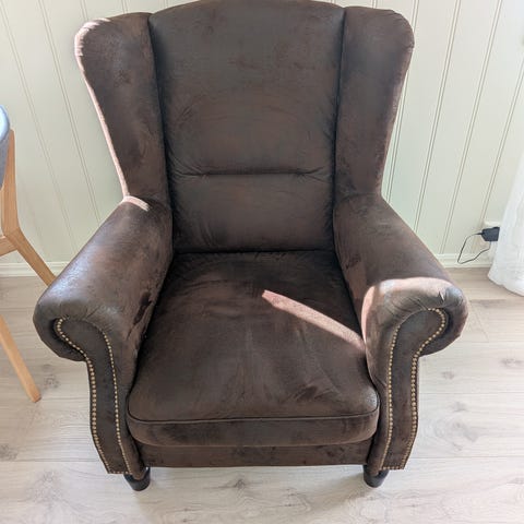 Lenestol i lyst skinn, cognac. Ser mørk ut på bilde, ligner mest på fargen på første bilde. Mykt skinn, litt slitt i sete. En helt løs knapp og en nesten løs knapp. Mener dette er en replika av kjent designerstol, men husker ikke hvilken. Kom med bud.