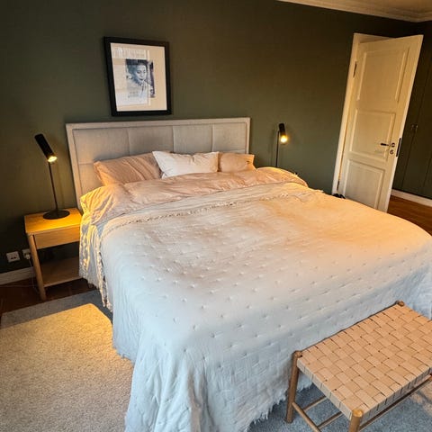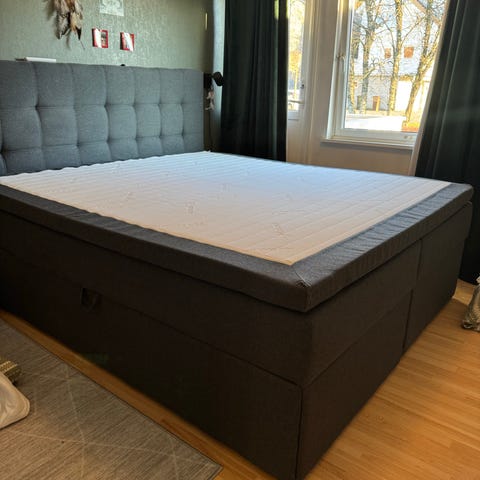 2 senger, dobbel overmadrass og ubrukt hodegavl. Selges samlet:-)
