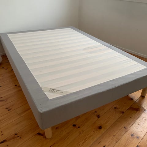 IKEA Sultan Singås rammemadrass med treben, gis bort ved henting snarest. Sengen er hel og uten skader, men fått noen flekker på sidene fra transporten. Brukt med overmadrass, fra røykfritt og dyrefritt hjem.