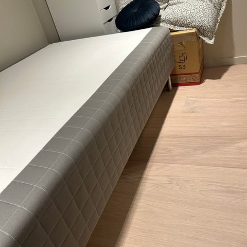 IKEA Seng med grått stofftrekk + madrass