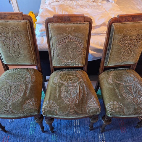 AI-beskrivelse: Sett med antikke stoler med forskjellige farger på polstringen: grønn, rosa og grønn. Stolene har trerammer og ulike ryggstiler, inkludert buede og knappe-dekorative ryggstøtter. Materialet på setene er tekstil i fløyelslignende stoff. Passer til bruk som spisestuestoler eller dekorative møbler.