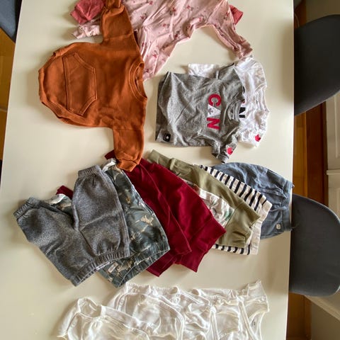 Bodyer, bukser, sett (3 stk bodyer og bukse hvorav den mørkeste har noen mindre hull i bodyen, 1 stk genser og bukse)., heldress og sparkebukse.